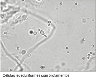 Ø Leveduras: As células leveduriformes podem ser observadas no sedimento urinário devido à contaminação por secreção vaginal ou ainda por contaminação pela pele ou pelo ambiente. As leveduras estão presentes em secreções vaginais de indivíduos com infecção pelo fungo, freqüentemente em pacientes diabéticos e/ou imunossuprimidos. As principais leveduras observadas são Candida sp. Essas se apresentam como células ovóides, com tamanho de 5 a 7 micra, incolores e refringentes. Muitas vezes apresentam brotamentos, devido à germinação, e pseudohifas. Na transcrição do resultado a presença de leveduras deve ser relatada da seguinte forma: "Presença de células leveduriformes (pseudohifas) com aspecto morfológico de Candida sp".